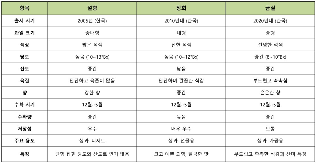 설향은 주로 온실 재배로 품질이 균일하며 12월에서 이듬해 5월로 출하 시기가 타 품종에 비해 긴편입니다. 재배 난이도가 비교적 낮아서 농가의 재배 선호도가 높아 그만큼 생산량 또한 타 품종에 비해 많은 편입니다.
